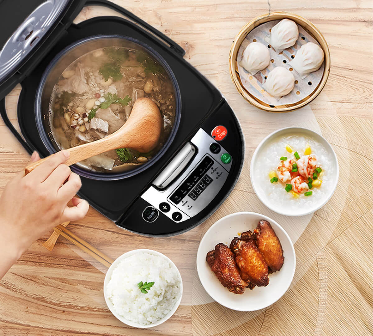 - Мультикомп'ютерний контроль, дисплей і безліч режимів приготування